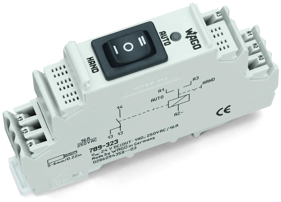 przekaźnik; znamionowe napięcie wejściowe 24 V DC; 1 zestyk zwierny; maksymalny prąd długotrwały 16 A; do obciążeń lampowych; przełącznik ręczny-0-automatyczny; sygnalizacja statusu czerwony; szerokość 18 mm; 2,50 mm²; szary