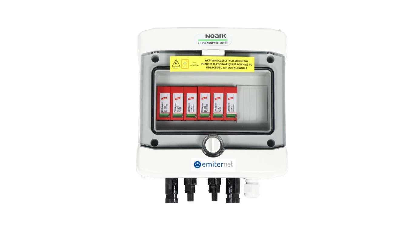 Rozdzielnica hermetyczna EMITER z ogranicznikiem przepięć DC Dehn 1000V typu 2, 2x łańcuch PV, 2x MPPT o numerze katalogowym EM-2_DC w kategorii Obudowy, Zabezpieczenie instalacji. Produkt wyprodukowany przez markę EMITER, seria ZABEZPIECZENIE INSTALACJI.