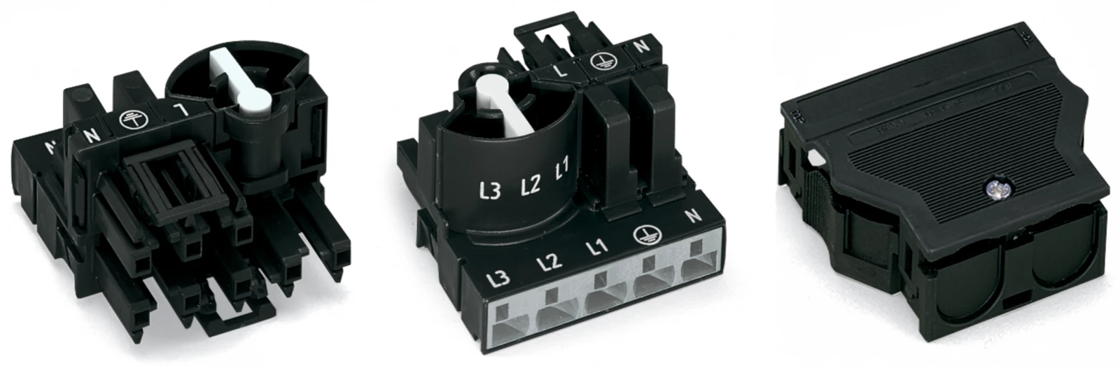 rozgałęźnik trójfazowy na jednofazowy; z możliwością wyboru fazy; 5-bieg./3-bieg.; kodowanie A; 1 wejście; 2 wyjścia; z podłączeniem przewodu na wejściu; czarny