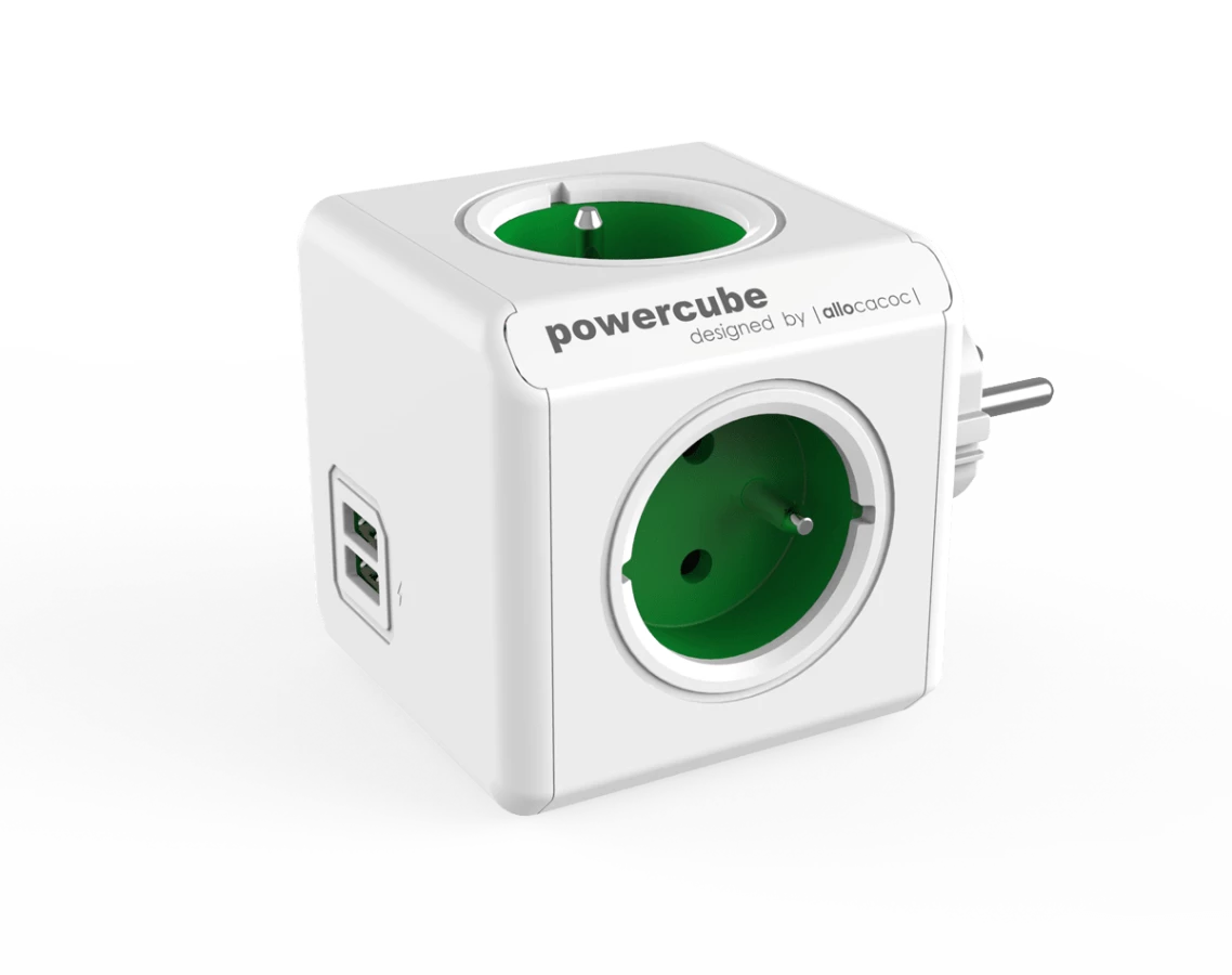 ROZGAŁĘŹNIK 4X Z/U + WTYCZKI US/ UK/ EU/ AU + 2X USB-A GNIAZDO E/(FR) ZIELONY POWERCUBE