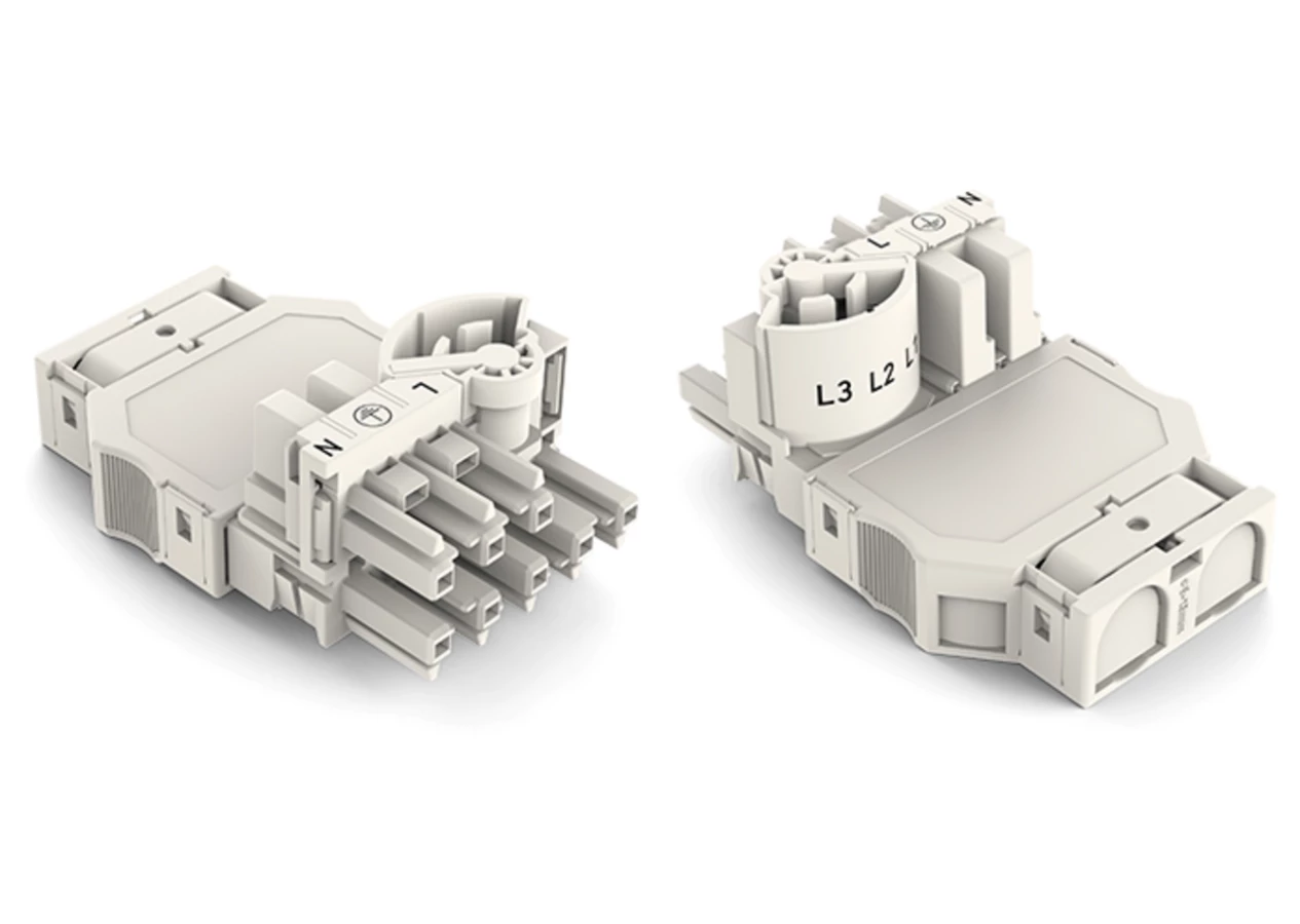 rozgałęźnik trójfazowy na jednofazowy; z możliwością wyboru fazy; 5-bieg./3-bieg.; kodowanie A; 1 wejście; 2 wyjścia; z podłączeniem przewodu na wejściu; biały