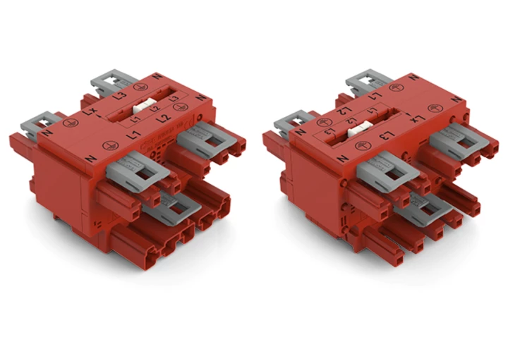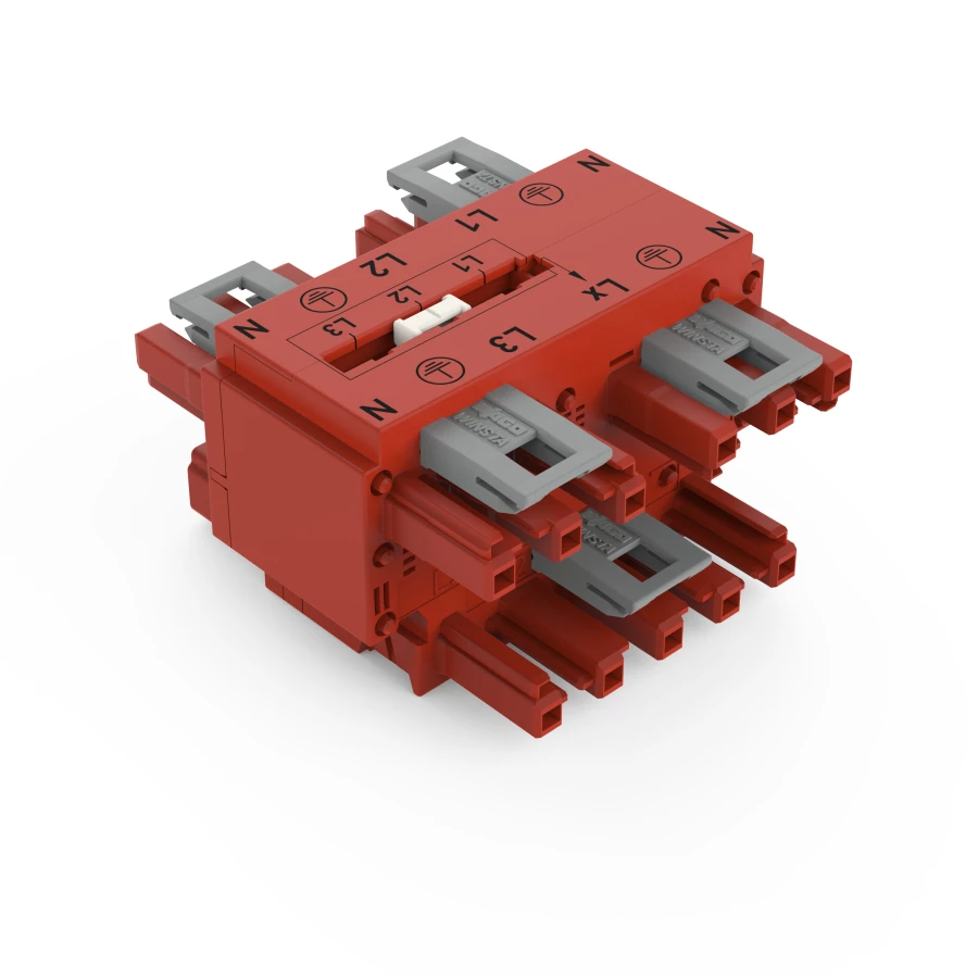 rozgałęźnik trójfazowy na jednofazowy; z możliwością wyboru fazy; 5-bieg./3-bieg.; kodowanie P; 1 wejście; 5 wyjść; czerwony