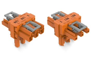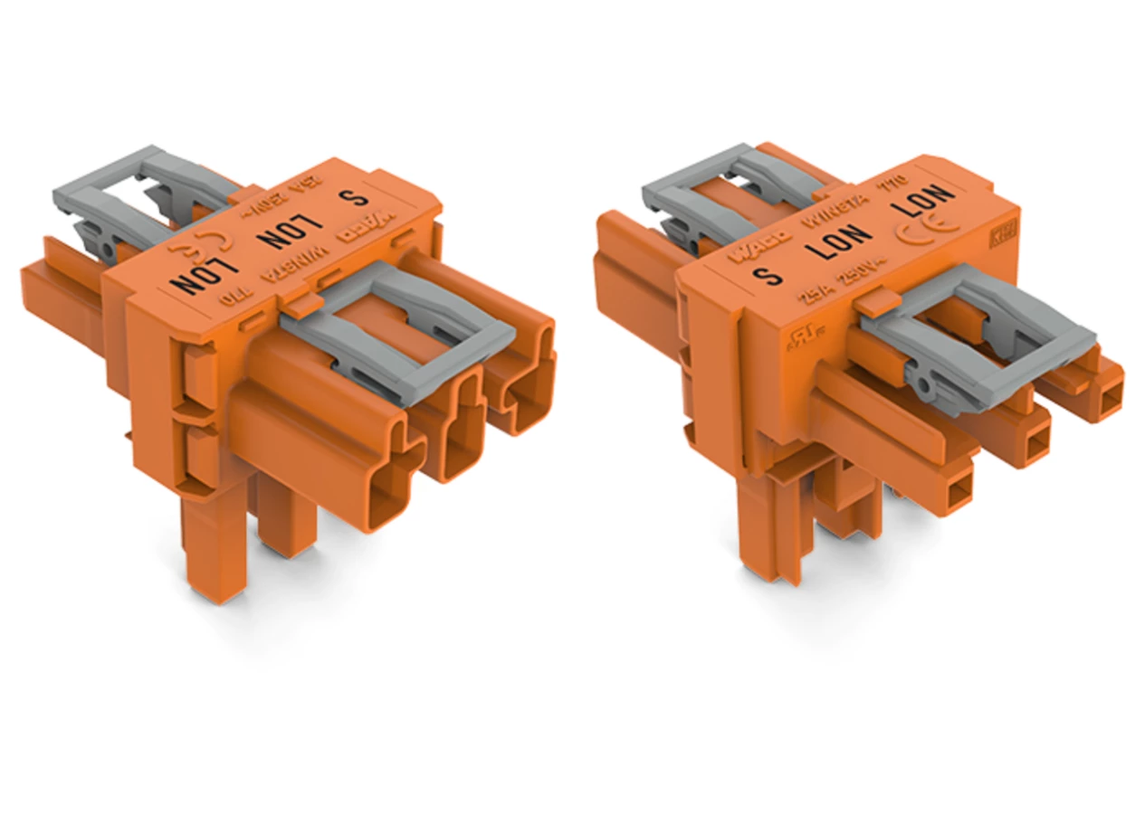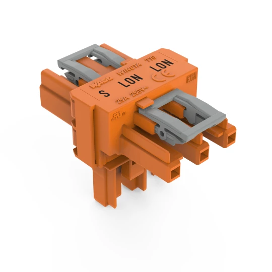 rozgałęźnik typu T; 3-bieg.; kodowanie R; 1 wejście; 2 wyjścia; 2 zaczepy ryglujące; pomarańczowy