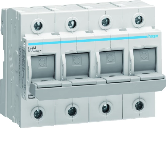 Modułowy rozłącznik bezpiecznikowy poziomy D02 4P 63A 400VAC 110/220VDC o numerze katalogowym L74M w kategorii Rozłączniki bezpiecznikowe NH, Rozłączniki bezpiecznikowe. Produkt wyprodukowany przez markę HAGER.