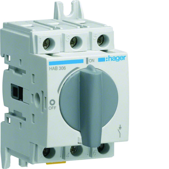 Rozłącznik obciązenia 3P 63A o numerze katalogowym HAB306 w kategorii Wyłączniki i rozłączniki modułowe, Wyłączniki, rozłączniki. Produkt wyprodukowany przez markę HAGER.
