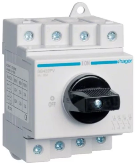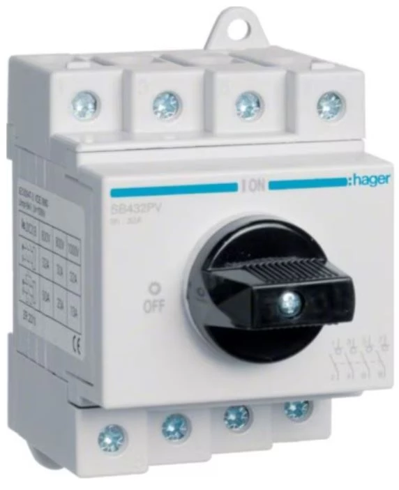 Modułowy rozłącznik izolacyjny do systemów fotowoltaicznych 4P 32A 1000 VDC o numerze katalogowym SB432PV w kategorii Rozłączniki, wyłączniki DC, Zabezpieczenie instalacji. Produkt wyprodukowany przez markę HAGER.