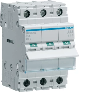 Modułowy rozłącznik izolacyjny 3P 63A 400VAC o numerze katalogowym SBN363 w kategorii Wyłączniki i rozłączniki modułowe, Wyłączniki, rozłączniki. Produkt wyprodukowany przez markę HAGER.