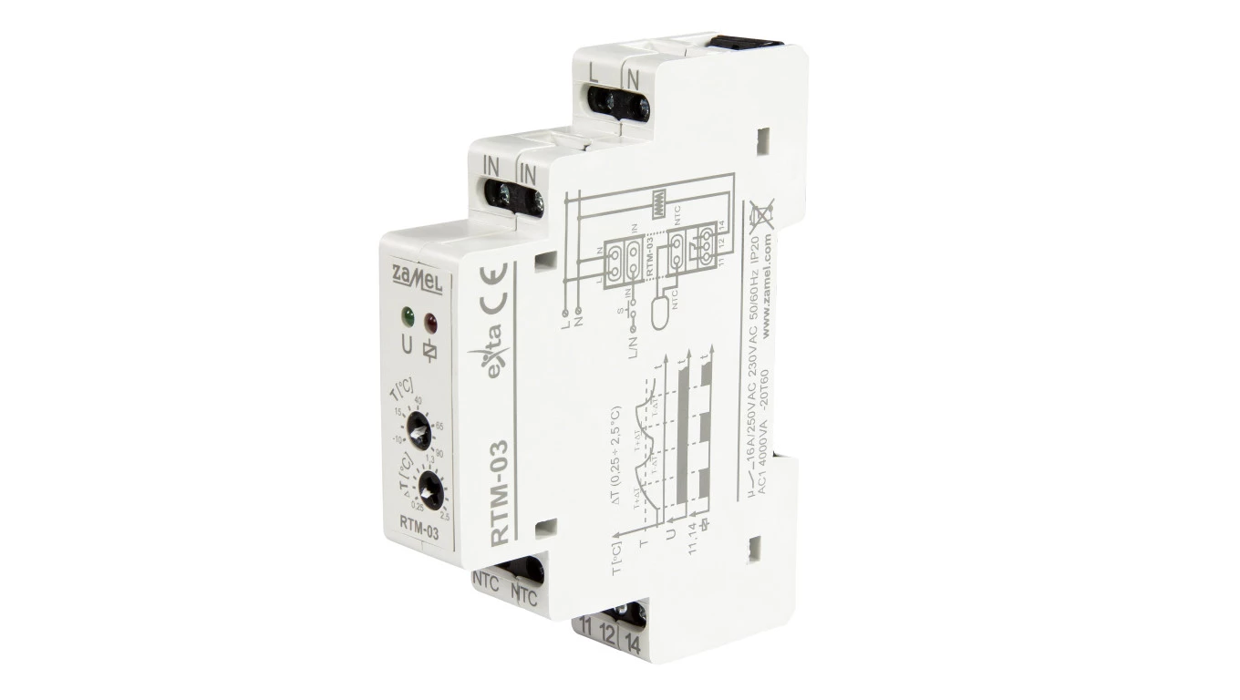 Regulator temperatury od -10 do 90°C, jednomodułowy, z nastawą histerezy 0,25 - 2,5°C RTM-03 o numerze katalogowym   EXT10000251 w kategorii Regulatory, termostaty, programatory>Pozostałe regulatory. Produkt wyprodukowany przez markę ZAMEL.