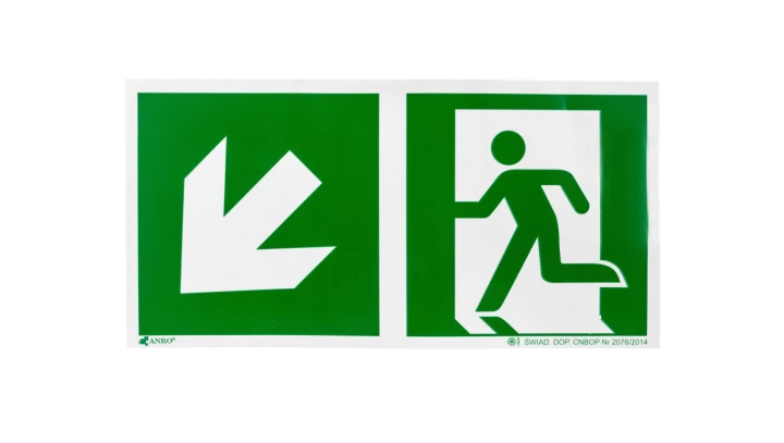 Samoprzylepna tabliczka ostrzegawcza /Kierunek do wyjścia w lewo i w dół 150x300/ IE/001/2/A/FS