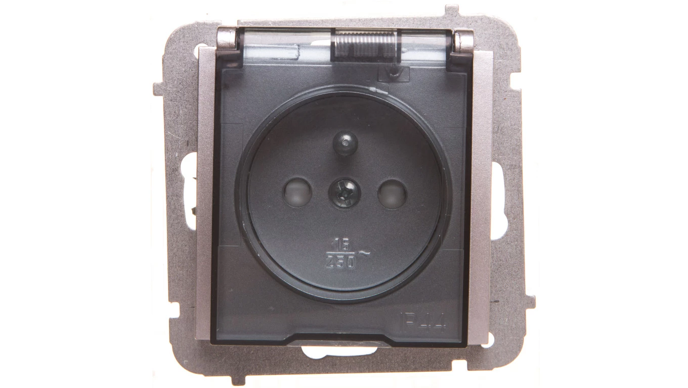 Simon 54 Gniazdo bryzgoszczelne z/u IP44 z klapką transparentną antracyt DGZ1BZ.01/48A