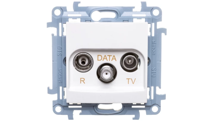 Gniazdo antenowe R-TV-DATA (moduł) częstotliwość dla wejścia 5-862 MH z. Tłum: R-14 dB, TV-10 dB, DATA -3 dB, biały Simon10 o numerze katalogowym CAD.01/11 w kategorii Gniazda teleinformacyjne, multimedialne, Łączniki i gniazda instalacyjne. Produkt wyprodukowany przez markę KONTAKT-SIMON, seria SIMON 10.