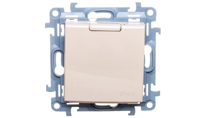 Gniazdo wtyczkowe Schuko do wersji IP44 z uszczelką z przesłonami torów prądowych - klapka w kolorze pokrywy (moduł) 16 A, 250 V~, zaciski śrubowe, beż Simon10 o numerze katalogowym CGSZ1BZ.01/41 w kategorii Gniazda podtynkowe, Gniazda instalacyjne. Produkt wyprodukowany przez markę KONTAKT-SIMON, seria SIMON 10.