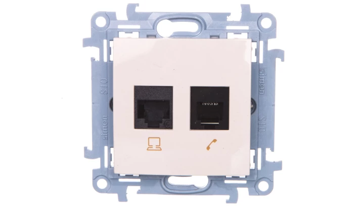 Gniazdo RJ45 kat. 6 + gniazdo telefoniczne RJ12 (moduł), beż Simon10 o numerze katalogowym C6T.01/41 w kategorii Gniazda teleinformacyjne, multimedialne, Łączniki i gniazda instalacyjne. Produkt wyprodukowany przez markę KONTAKT-SIMON, seria SIMON 10.