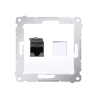 Gniazdo komputerowe pojedyncze RJ45 kategoria 6 ekranowane z przesłoną przeciwkurzową, biały Simon54 o numerze katalogowym D61E.01/11 w kategorii Gniazda teleinformacyjne, multimedialne, Łączniki i gniazda instalacyjne. Produkt wyprodukowany przez markę KONTAKT-SIMON, seria SIMON 54.