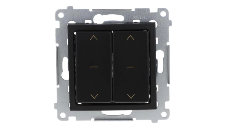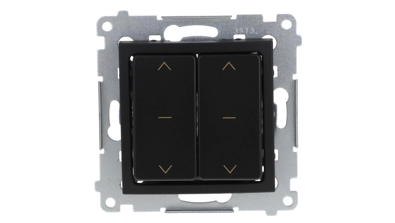 Łącznik roletowy podwójny (moduł) 10A, 250V~, szybkozłącza. W komplecie z pierścieniem dekoracyjnym, czarny mat Simon54 o numerze katalogowym DZW2.01/49 w kategorii Przyciski żaluzjowe, Przyciski. Produkt wyprodukowany przez markę KONTAKT-SIMON, seria SIMON 54.