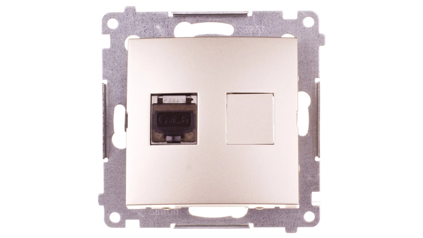 Gniazdo komputerowe pojedyncze RJ45 kategoria 6, ekranowane z przesłoną przeciwkurzową (moduł), złoty mat, SIMON54 o numerze katalogowym D61E.01/44 w kategorii Gniazda teleinformacyjne, multimedialne, Łączniki i gniazda instalacyjne. Produkt wyprodukowany przez markę KONTAKT-SIMON, seria SIMON 54.