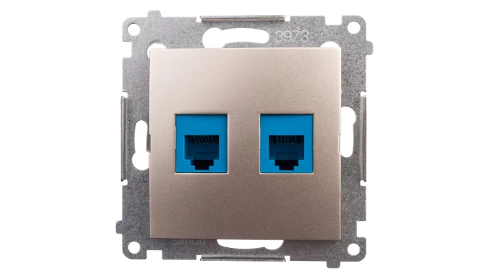 Gniazdo telefoniczne RJ12 podwójne, złoty mat Simon54 o numerze katalogowym DT2.01/44 w kategorii Gniazda teleinformacyjne, multimedialne, Łączniki i gniazda instalacyjne. Produkt wyprodukowany przez markę KONTAKT-SIMON, seria SIMON 54.