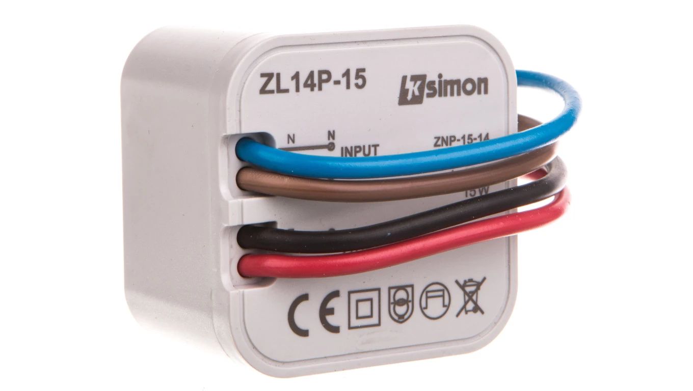 Zasilacz LED dopuszkowy 14V, DC, 15W, SIMON54 o numerze katalogowym ZL14P-15 w kategorii Pozostały osprzęt mieszkaniowy, biurowy, Osprzęt mieszkaniowy, biurowy i RTV. Produkt wyprodukowany przez markę KONTAKT-SIMON, seria SIMON 54.