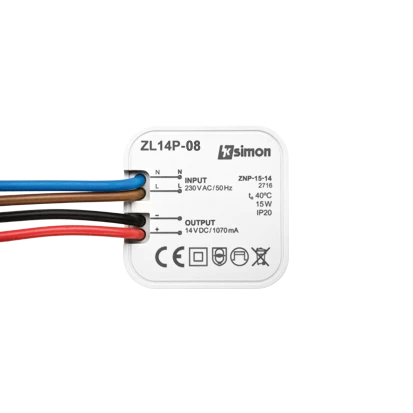 Zasilacz LED dopuszkowy 14V, DC, 8W, SIMON54 o numerze katalogowym ZL14P-08 w kategorii Pozostały osprzęt mieszkaniowy, biurowy, Osprzęt mieszkaniowy, biurowy i RTV. Produkt wyprodukowany przez markę KONTAKT-SIMON, seria SIMON 54.