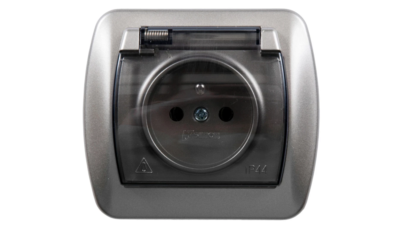 Simon 54 Gniazdo bryzgoszczelne z/u IP44 z klapką transparentną antracyt DGZ1BZ.01/48A