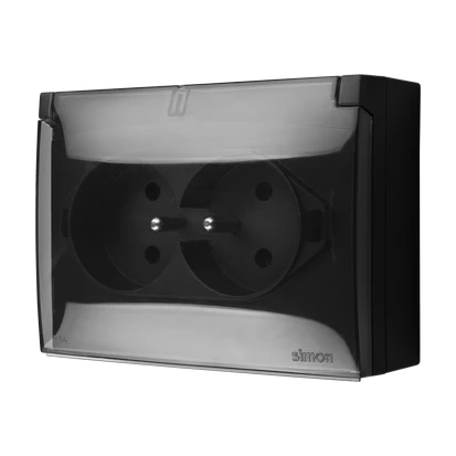 SIMON AQUACLICK CZARNY MAT GNIAZDO NT 2X Z/U Z KLAPĄ TRANSP. Z PRZESŁ. TORÓW PRĄD. IP44 ZAC. ŚRUBOWE