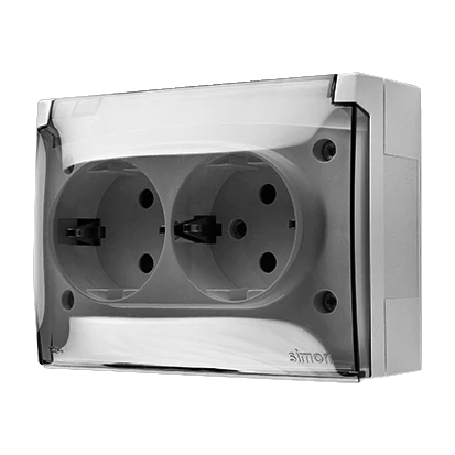 Gniazdo wtyczkowe natynkowe, Schuko, podwójne kompaktowe, klapka transparentna, IP44, 16 A, 250 V~, zaciski śrubowe, biały, AQUACLICK o numerze katalogowym ACGSZ2/11A w kategorii Gniazda natynkowe, Gniazda instalacyjne. Produkt wyprodukowany przez markę KONTAKT-SIMON, seria AQUACLICK.