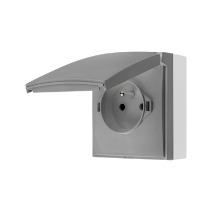 Gniazdo wtyczkowe natynkowe, pojedyncze z uziemieniem, klapka w kolorze pokrywy, IP44, 16 A, 250 V~, szybkozłącza, szary, AQUACLICK o numerze katalogowym ACGZ1C/16 w kategorii Gniazda natynkowe, Gniazda instalacyjne. Produkt wyprodukowany przez markę KONTAKT-SIMON, seria AQUACLICK.
