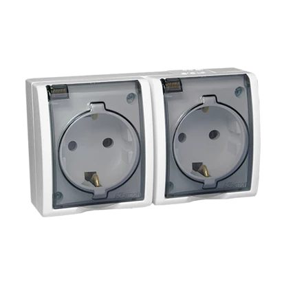 Gniazdo wtyczkowe z uziemieniem Schuko podwójne bryzgoszczelne IP54, klapka transparentna, biały, AQUARIUS o numerze katalogowym AQGSZ1-2/11A w kategorii Gniazda podtynkowe, Gniazda instalacyjne. Produkt wyprodukowany przez markę KONTAKT-SIMON, seria AQUARIUS.
