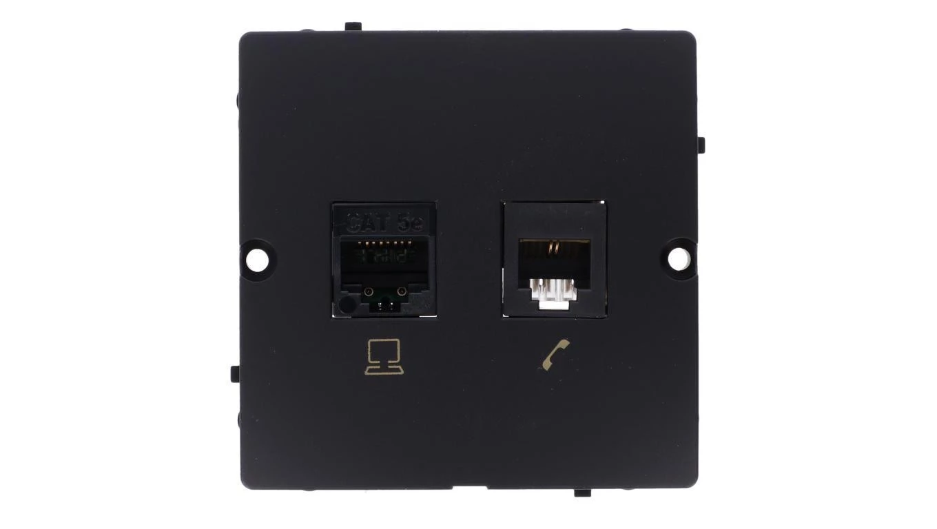 Simon Basic Gniazdo komputerowe RJ45 kat.5e + telefoniczne RJ11 (moduł). Montaż gniazda na wkręty do puszki czarny BMF5T.02/49