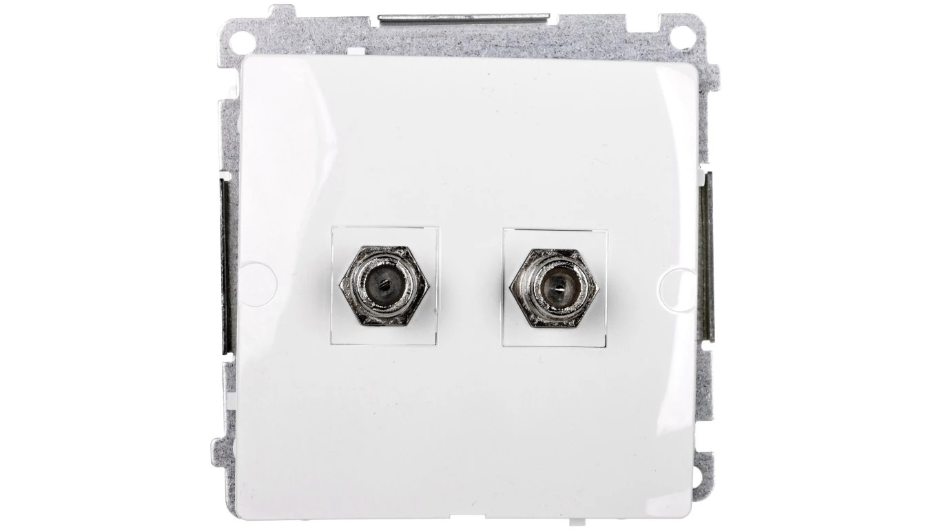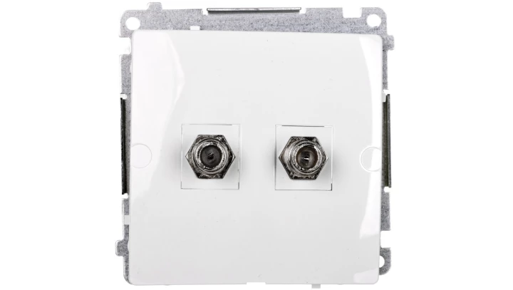 Gniazdo antenowe typu "F" podwójne, Basic moduł biały o numerze katalogowym BMAF2.01/11 w kategorii Gniazda teleinformacyjne, multimedialne, Łączniki i gniazda instalacyjne. Produkt wyprodukowany przez markę KONTAKT-SIMON, seria BASIC MODUŁ.