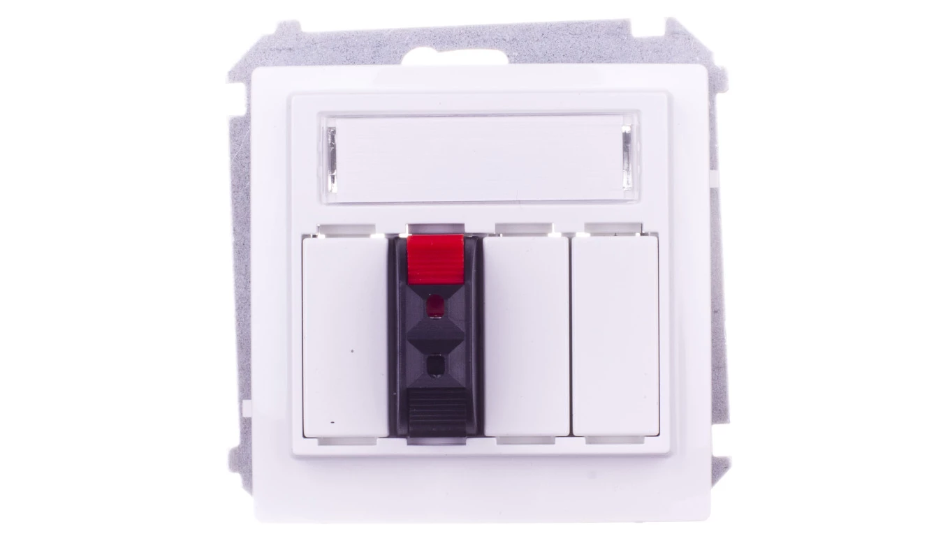 Gniazdo głośnikowe 1-krotne z polem opisowym (moduł). Przekrój przew. dla wejścia i wyjścia 2,5 mm2. Mocowanie na łapki i wkręty, biały, BASIC MODUŁ o numerze katalogowym BMGL31.01/11 w kategorii Gniazda głośnikowe, Łączniki i gniazda instalacyjne. Produkt wyprodukowany przez markę KONTAKT-SIMON, seria BASIC MODUŁ.