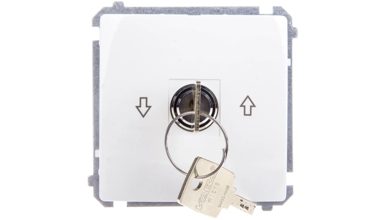 Łącznik roletowy z kluczem, 3 pozycyjny, I-0-II 2 styki N/O. Możliwość wyjęcia klucza w każdej pozycji, biały, BASIC MODUŁ o numerze katalogowym BMWZK.01/11 w kategorii Łączniki podtynkowe jednobiegunowe, Łączniki jednobiegunowe. Produkt wyprodukowany przez markę KONTAKT-SIMON, seria BASIC MODUŁ.