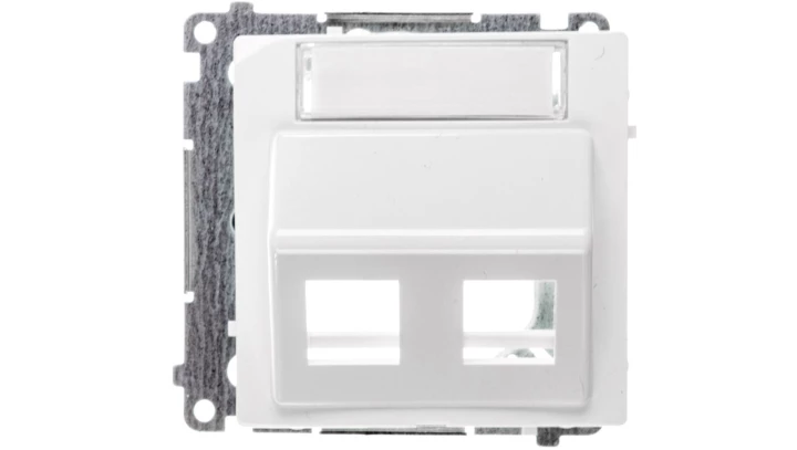 Pokrywa gniazd teleinformatycznych na Keystone skośna podwójna z polem opisowym. Montaż na łapki lub wkręty Basic moduł biały o numerze katalogowym BMGKS2P.01/11 w kategorii Plakietki, Ramki, klawisze, plakietki. Produkt wyprodukowany przez markę KONTAKT-SIMON, seria BASIC MODUŁ.