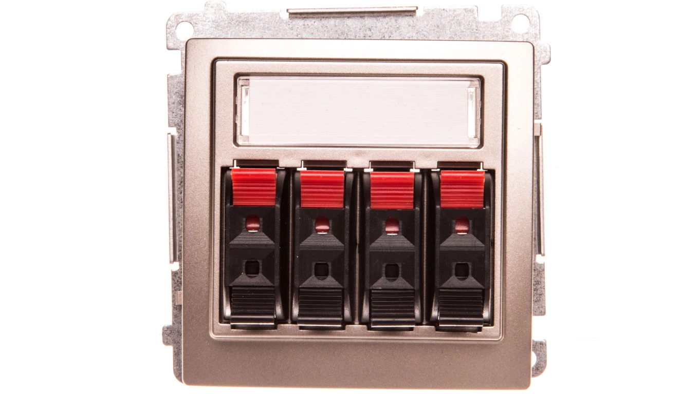 Gniazdo głośnikowe 4-krotne z polem opisowym (moduł). Do podłączenia 4 kolumn głośnikowych. Mocowanie gniazda na łapki i wkręty, satynowy, BASIC MODUŁ o numerze katalogowym BMGL34.01/29 w kategorii Gniazda głośnikowe, Łączniki i gniazda instalacyjne. Produkt wyprodukowany przez markę KONTAKT-SIMON, seria BASIC MODUŁ.