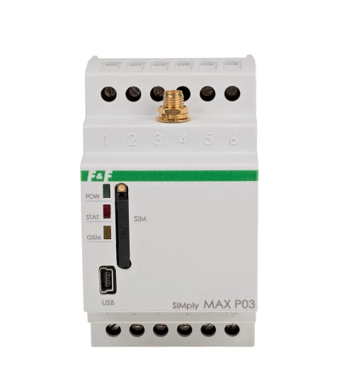 Przekaźnik zdalnego sterowania gsm (sms), 2xwy, 2xwe, sterowanie temperaturą, 230v ac, 2x1no/nc, montaż na szynie din SIMplyMAX-P03 o numerze katalogowym SIMPLYMAX-P03 w kategorii Przekaźniki - pozostałe, Przekaźniki. Produkt wyprodukowany przez markę F&F.
