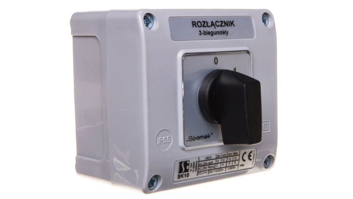 Łącznik Krzywkowy 10A, Rozłącznik 0-1 (3 - biegunowy), w obudowie OB11, o numerze katalogowym SK10-2.8211\OB11 w kategorii Wyłączniki i rozłączniki obrotowe, Wyłączniki, rozłączniki. Produkt wyprodukowany przez markę SPAMEL.