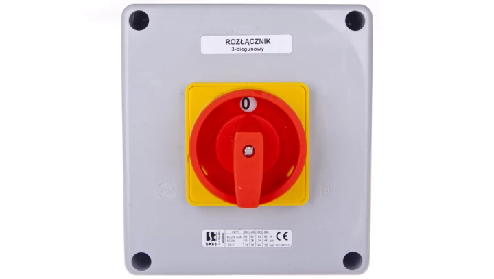 Łącznik Krzywkowy 63A, Rozłącznik 0-1 (3 - biegunowy), w obudowie OB16 z czołem zamykanym żółto/czerwonym o numerze katalogowym SK63-2.8211\OB16ZC w kategorii Wyłączniki i rozłączniki obrotowe, Wyłączniki, rozłączniki. Produkt wyprodukowany przez markę SPAMEL.