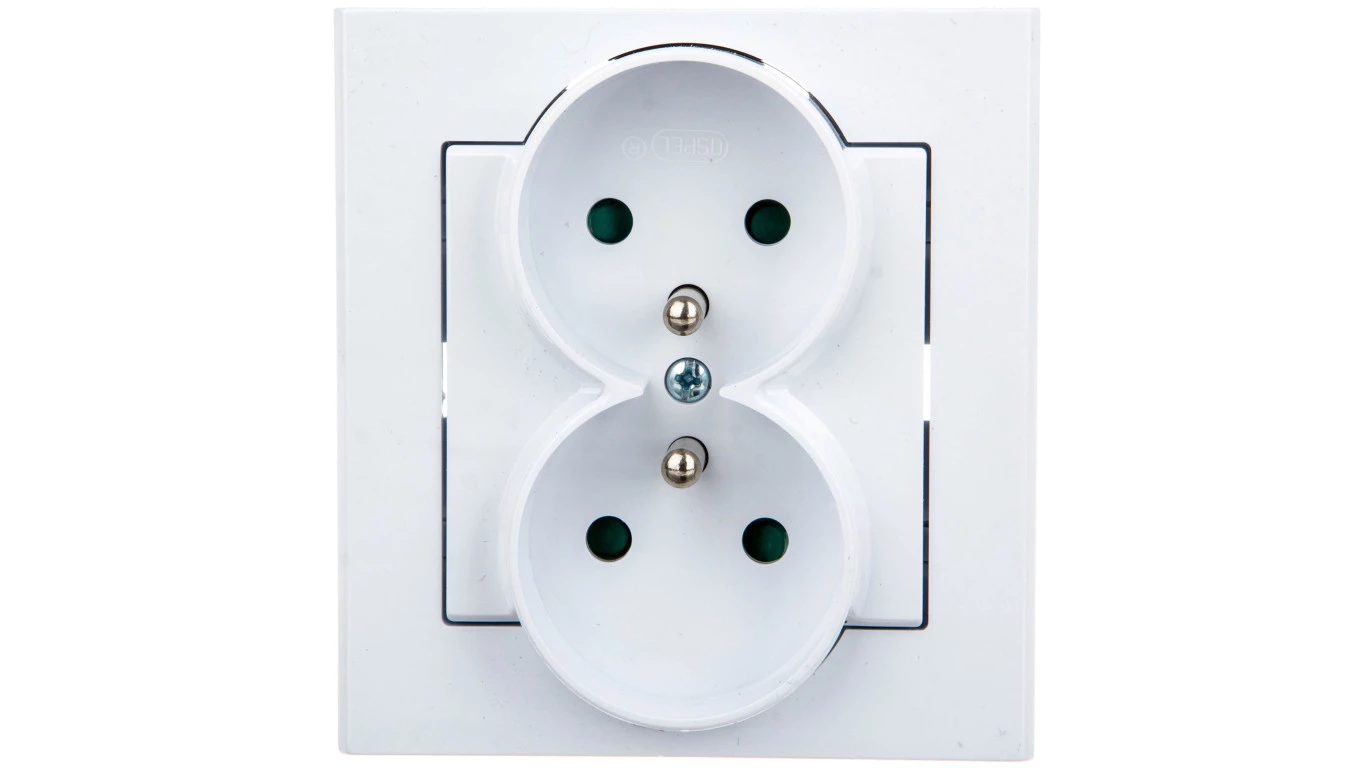 Gniazdo podwójne z uziemieniem z przesłonami torów prądowych, biały SONATA o numerze katalogowym GP-2RZP/00 w kategorii Gniazda podtynkowe, Gniazda instalacyjne. Produkt wyprodukowany przez markę OSPEL, seria SONATA.