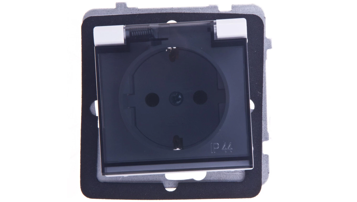 Simon 54 Gniazdo bryzgoszczelne z/u IP44 z klapką transparentną antracyt DGZ1BZ.01/48A