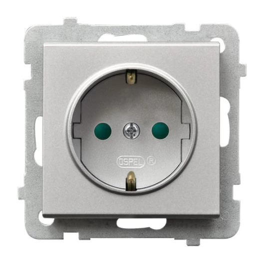 Gniazdo pojedyncze z uziemieniem schuko z przesłonami torów prądowych, srebro mat SONATA o numerze katalogowym GP-1RSP/M/38 w kategorii Gniazda podtynkowe, Gniazda instalacyjne. Produkt wyprodukowany przez markę OSPEL, seria SONATA.
