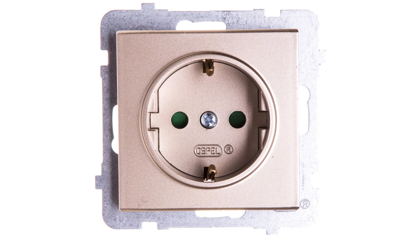 Gniazdo pojedyncze z uziemieniem schuko z przesłonami torów prądowych, szampański złoty SONATA o numerze katalogowym GP-1RSP/M/39 w kategorii Gniazda podtynkowe, Gniazda instalacyjne. Produkt wyprodukowany przez markę OSPEL, seria SONATA.