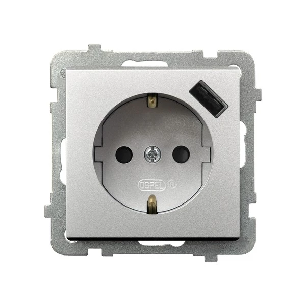 SONATA GNIAZDO POJEDYNCZE Z UZIEMIENIEM SCHUKO Z PRZESŁONAMI TORÓW PRĄDOWYCH, Z ŁADOWARKĄ USB SREBRO
