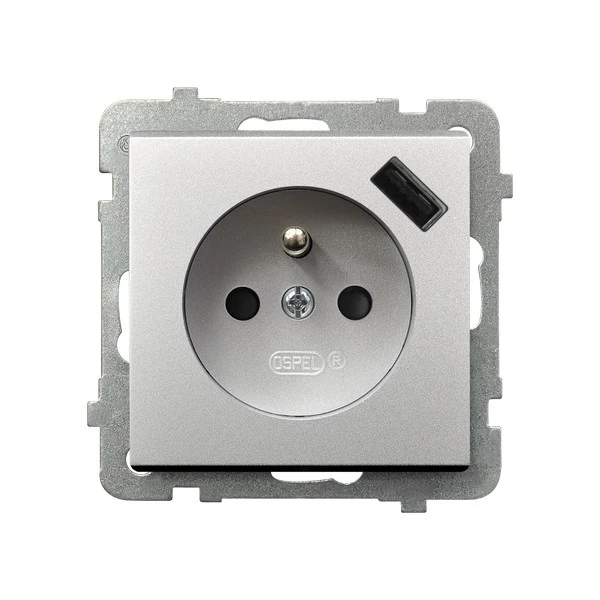 SONATA Gniazdo pojedyncze z uziemieniem z przesłonami torów prądowych, z ładowarką USB A+C srebro mat GP-1RZPUSBAC/m/38
