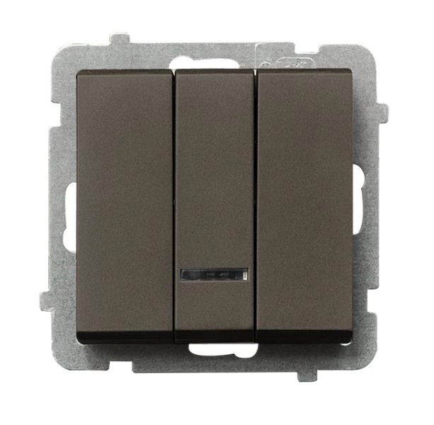 Łącznik potrójny z podświetleniem niebieskim, czekoladowy metal SONATA o numerze katalogowym ŁP-13RS/M/40 w kategorii Łączniki podtynkowe wielobiegunowe, Łączniki wielobiegunowe. Produkt wyprodukowany przez markę OSPEL, seria SONATA.