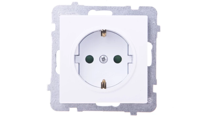 Gniazdo pojedyncze z uziemieniem schuko z przesłonami torów prądowych, biały SONATA o numerze katalogowym GP-1RSP/M/00 w kategorii Gniazda podtynkowe, Gniazda instalacyjne. Produkt wyprodukowany przez markę OSPEL, seria SONATA.
