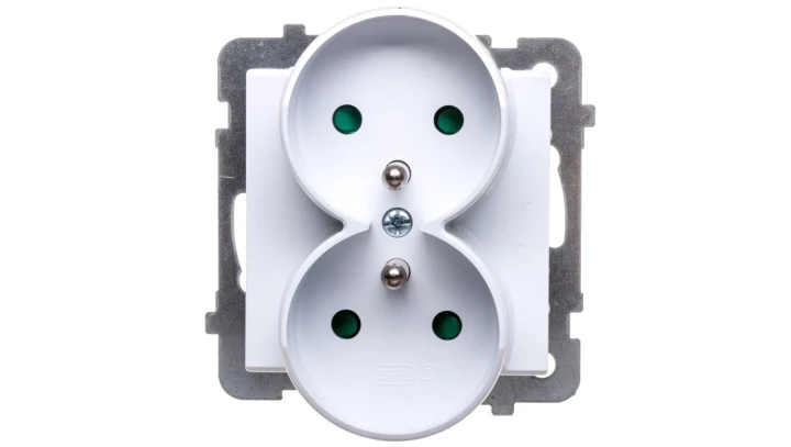 Gniazdo podwójne z uziemieniem z przesłonami torów prądowych, biały SONATA o numerze katalogowym GP-2RRZP/M/00 w kategorii Gniazda podtynkowe, Gniazda instalacyjne. Produkt wyprodukowany przez markę OSPEL, seria SONATA.