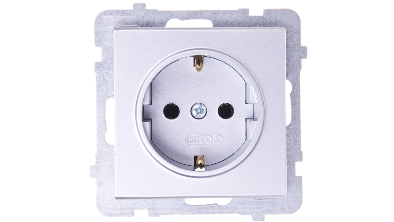Gniazdo pojedyncze z uziemieniem schuko, srebro mat SONATA o numerze katalogowym GP-1RS/M/38 w kategorii Gniazda podtynkowe, Gniazda instalacyjne. Produkt wyprodukowany przez markę OSPEL, seria SONATA.