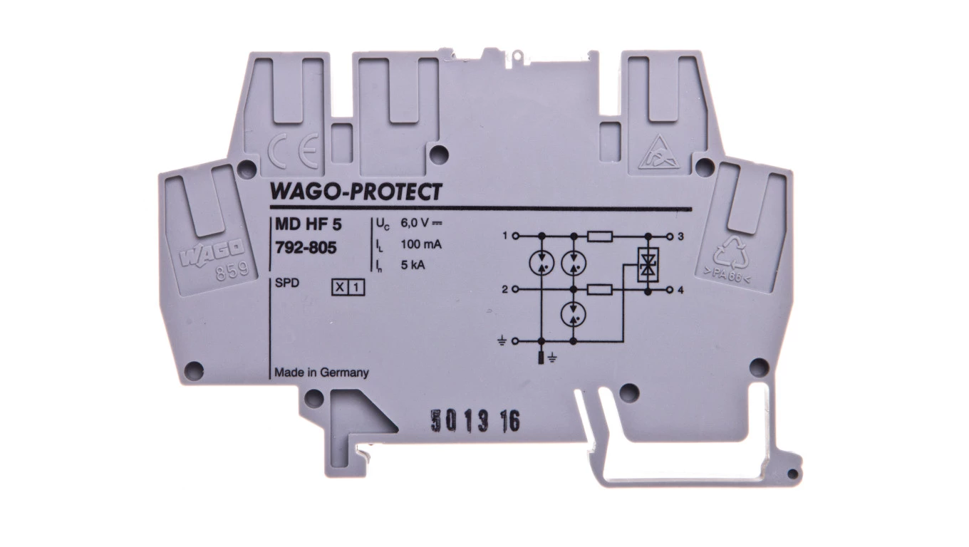 moduł ochrony przeciwprzepięciowej do techniki sygnałowej; napięcie znamionowe: 5 V DC; do 2 torów sygnałowych ze wspólnym odprowadzeniem; do interfejsów o dużej prędkość transmisji; 2-stop.; szerokość 6 mm; 2,50 mm²