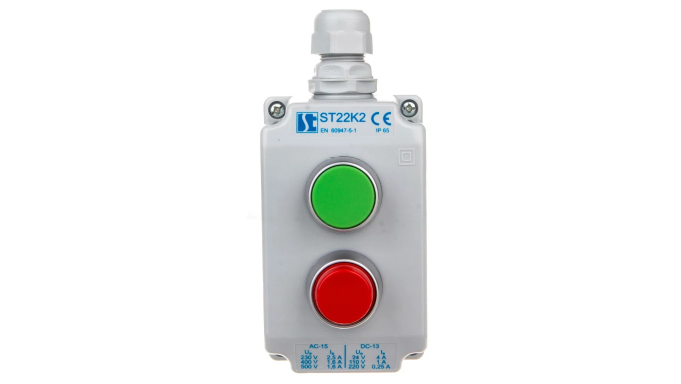 Kaseta sterownicza 2-otworowa z przyciskiem krytym zielonym (1NO), wystającym czerwonym (1NC), 1 dławnica metryczna M20 o numerze katalogowym ST22K2\02-1 w kategorii Przyciski i przełączniki sterownicze - akcesoria, Przyciski i przełączniki sterownicze. Produkt wyprodukowany przez markę SPAMEL, seria ST22.