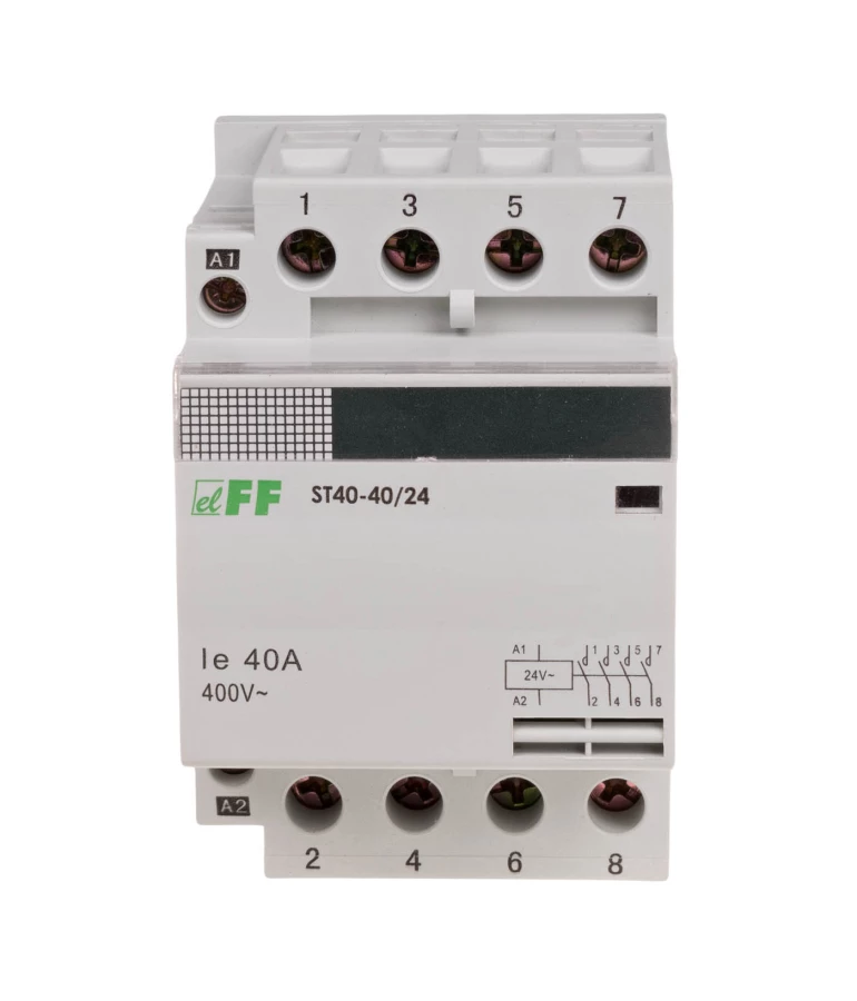 Stycznik modułowy ST40-40/24 stycznik modułowy styki 4NO I=40A nap. Cewki U=24V AC 3 moduły o numerze katalogowym ST40-40-24V w kategorii Styczniki instalacyjne, Styczniki. Produkt wyprodukowany przez markę F&F.